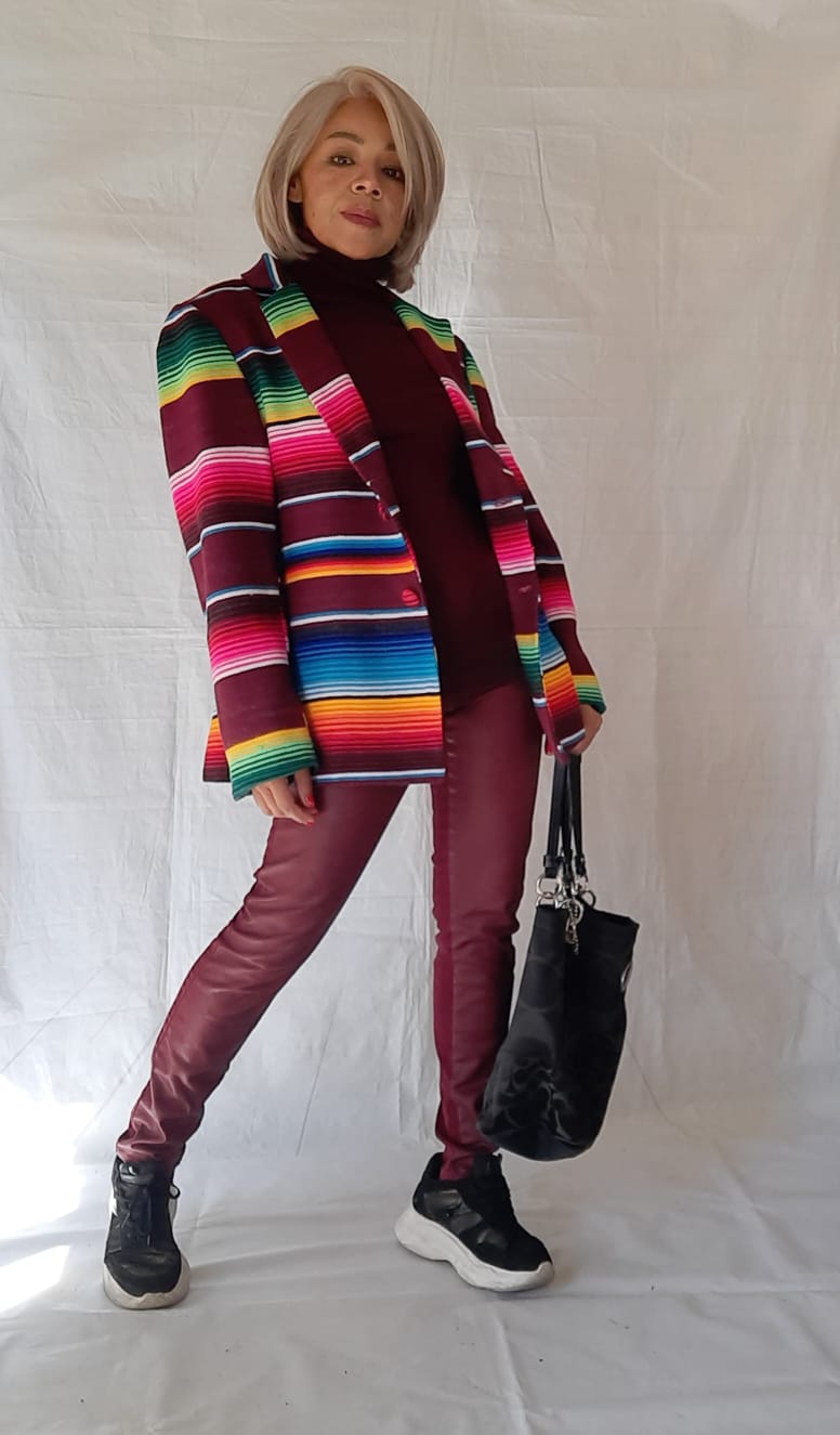 Blazer confeccionado en telar de Tlaxcala con mezcla de fibras y forrado.